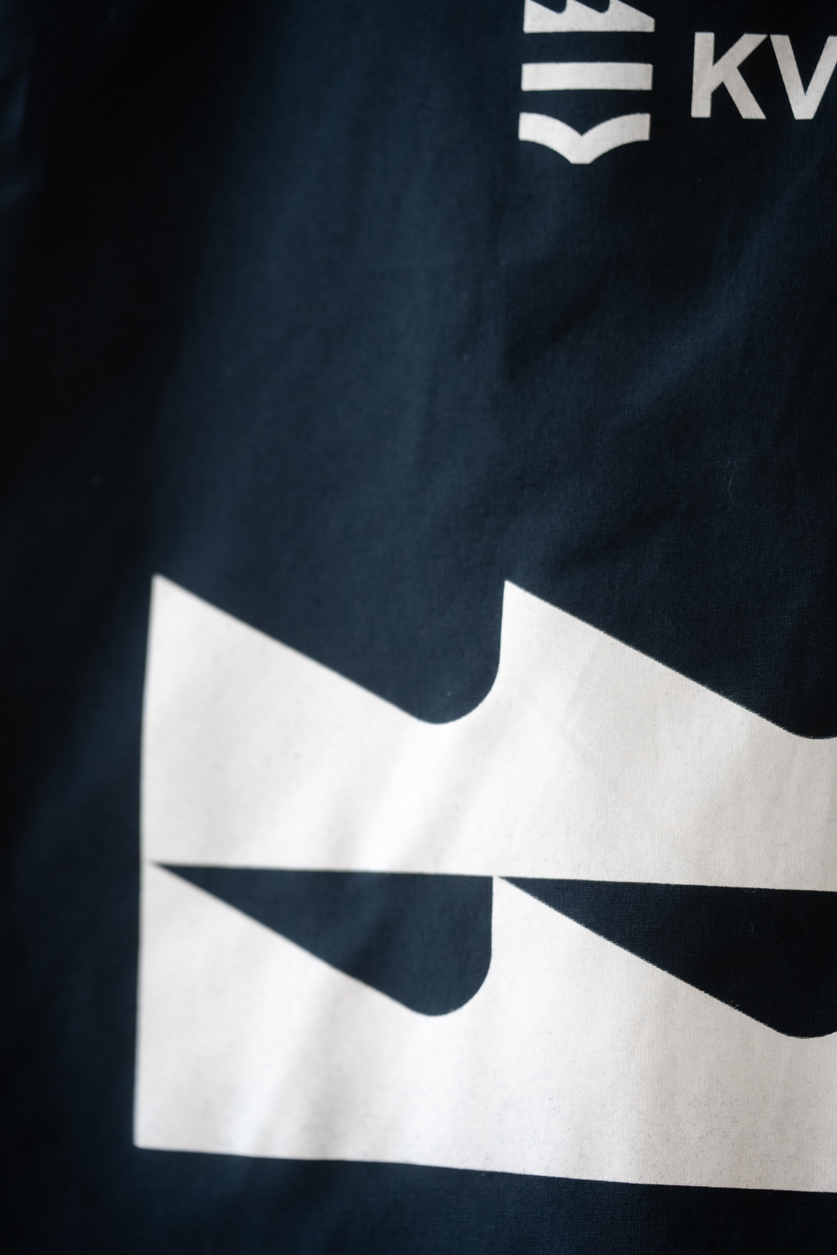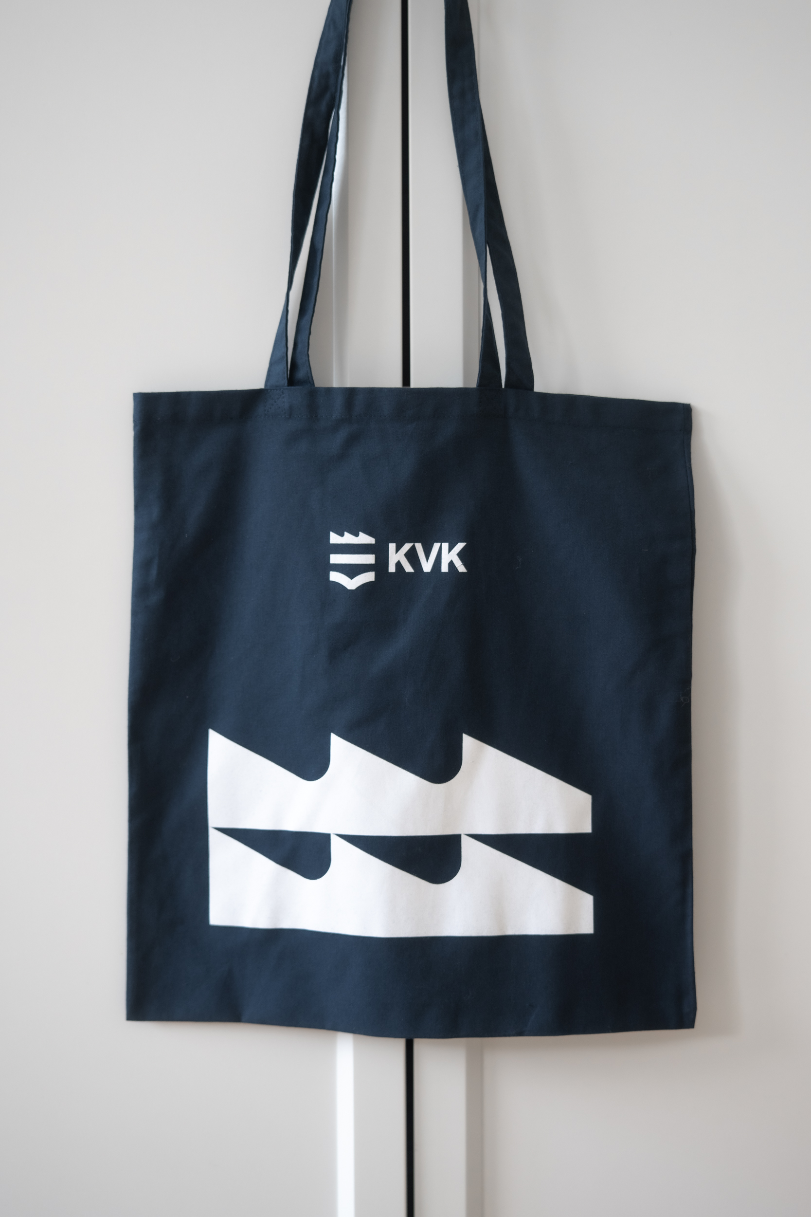 Tamsiai mėlynas, minimalistinio dizaino daugkartinis maišelis su ryškiu grafiniu akcentu ir baltu KVK logotipu. Patogus kasdienai – tinka neštis į paskaitas, biblioteką ar lengvam apsipirkimui po studijų.