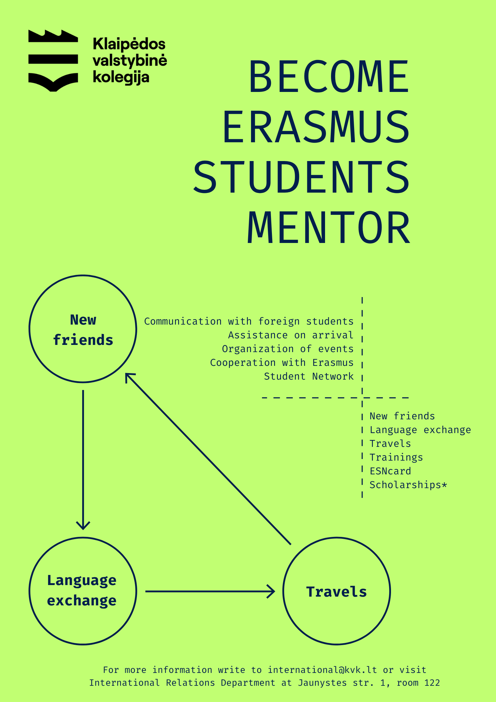 What is a mentor? It’s a student who helps foreign exchange students to integrate more easily into the new environment and aims to make their stay in Lithuania one of the funniest events in their lives. Help can be very diverse: