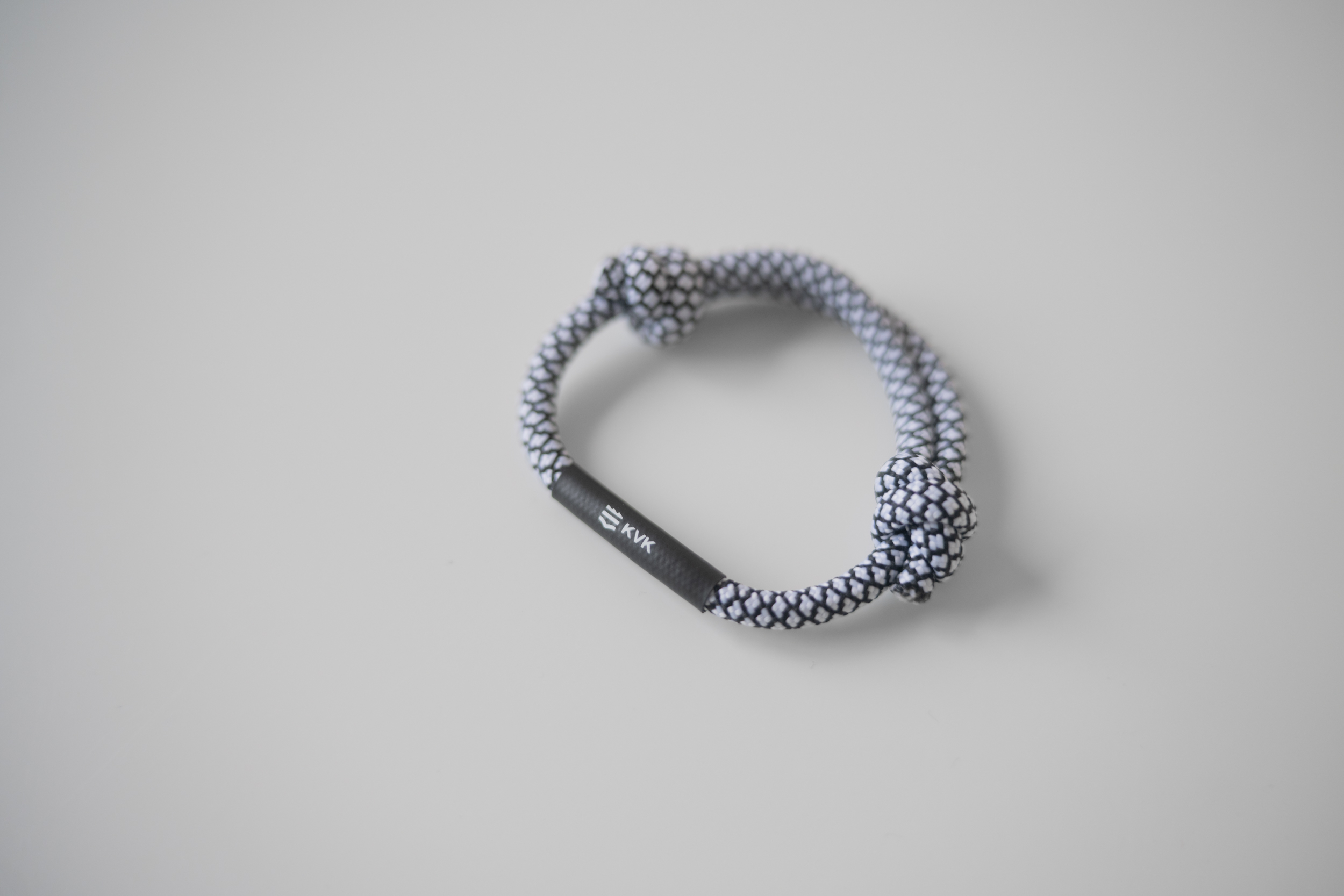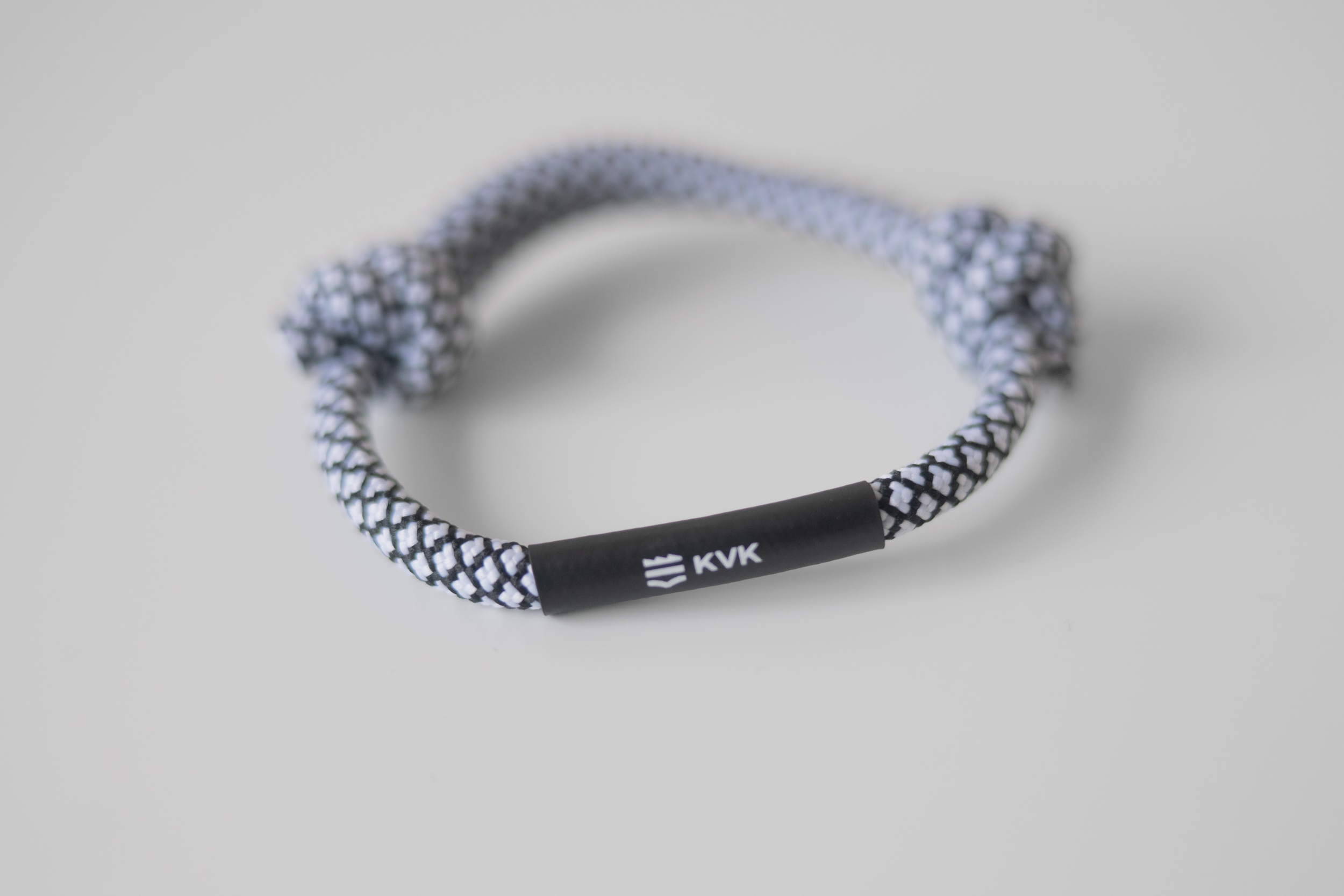 Minimalistinio dizaino, juodai baltos spalvos pintos virvelės apyrankė su subtiliu KVK logotipu.