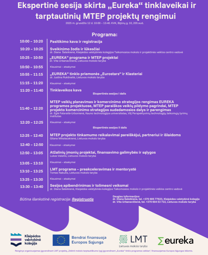 Renginio metu ekspertai pristatys „Eureka“, „Eurostars“, klasterių priemones ir praktinius patarimus, kaip sėkmingai parengti MTEP projektus kartu bendradarbiaujant su verslu.