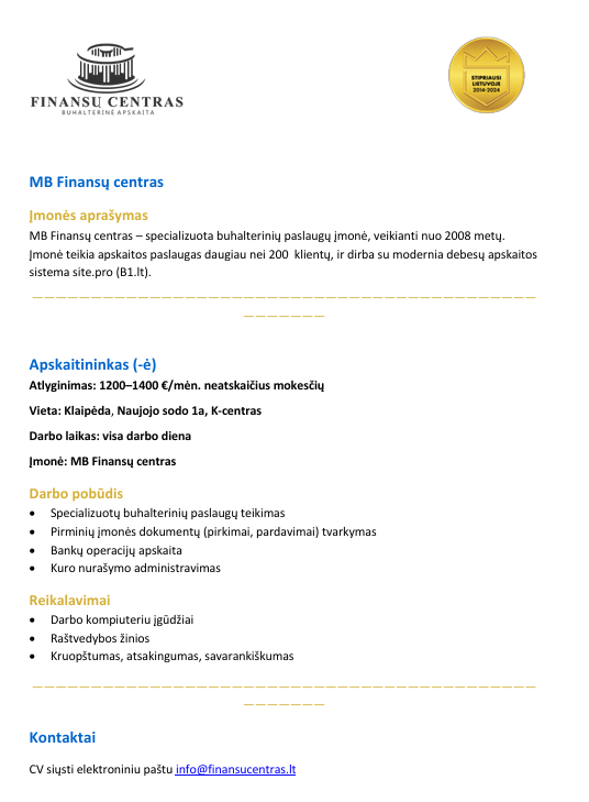 Pradinis Studentams Karjeros konsultavimas Apskaitininkas (-ė) MB Finansų centre